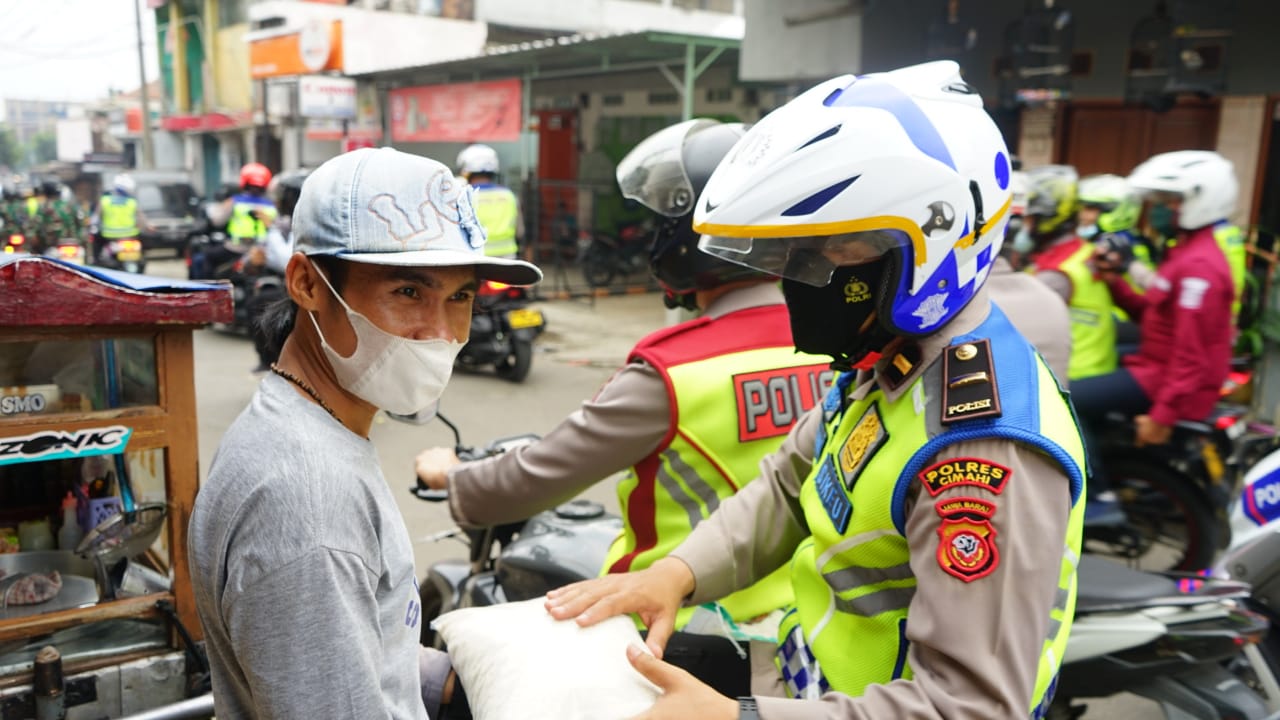 Dalam kegiatan tersebut Kapolres Cimahi Polda Jabar bersama Personil Pusdik Bekang Kodiklat TNI AD Cimahi membagikan beras kepada masyarakat yang membutuhkan di sepanjang jalan raya Cibereum dan Jalan Kebon Kopi Kota Cimahi.