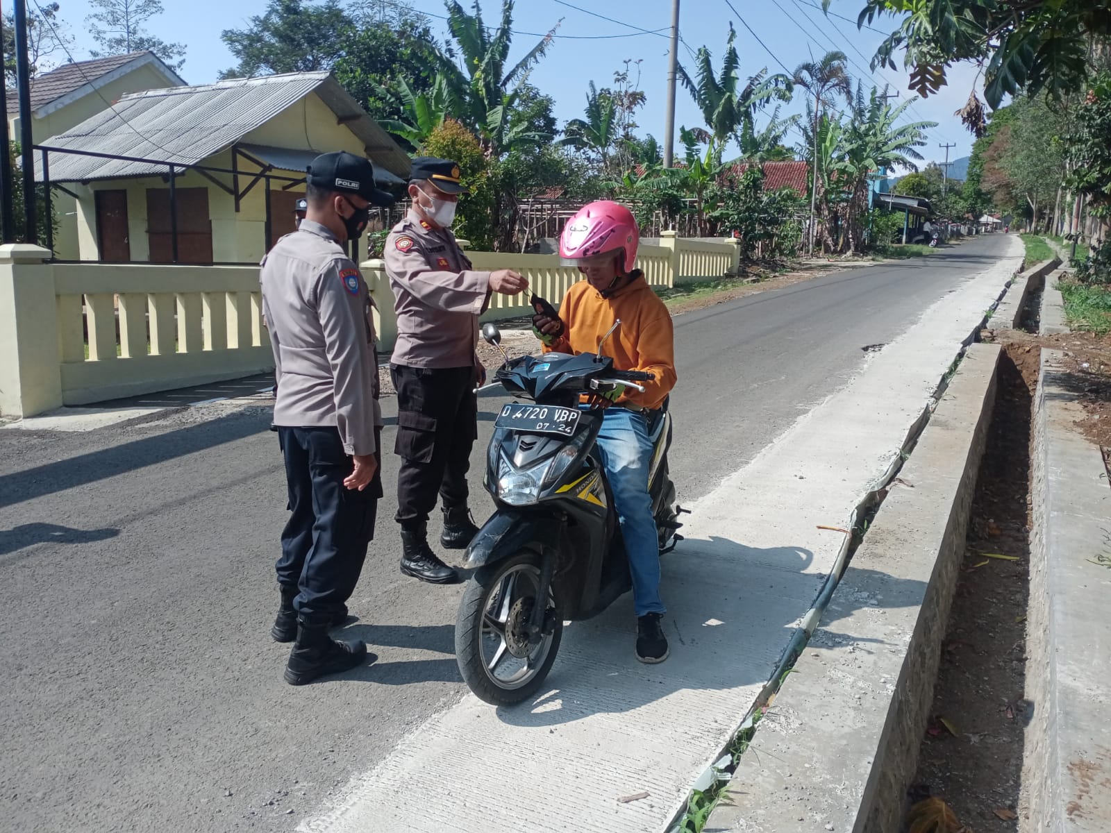 linestv.id, Majalengka (03/02) – Bhabinkamtibmas Polsek Lemahsugih Polres Majalengka Polda Jabar beserta anggota lainnya melaksanakan patroli himbauan prokes di wilayah Polsek Lemahsugih Polres Majalengka Polda Jabar sekaligus membagikan masker kepada warga, Kamis (3/2/2022).